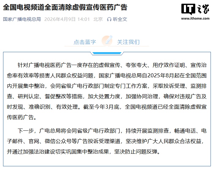 IT之家 4 月 9 日消息,广电总局今日发文,针对广播电视医药广告一度存在的虚假宣传、夸张夸大、用疗效作证明、宣传治愈率有效率等损害人民群众权益问题,国家广播电视总局自 2025 年 8 月起在全国范围内开展集中整治,会同省级广电行政部门制定专门工作方案,采取投诉受理、监测排查、研判认定、督促整改等措施,加大处置力度,加强协同治理,确保对违规广告及时发现、准确识别、有效处理。截至今年 3 月底,全国电视频道已经全面清除虚假宣传医药广告。