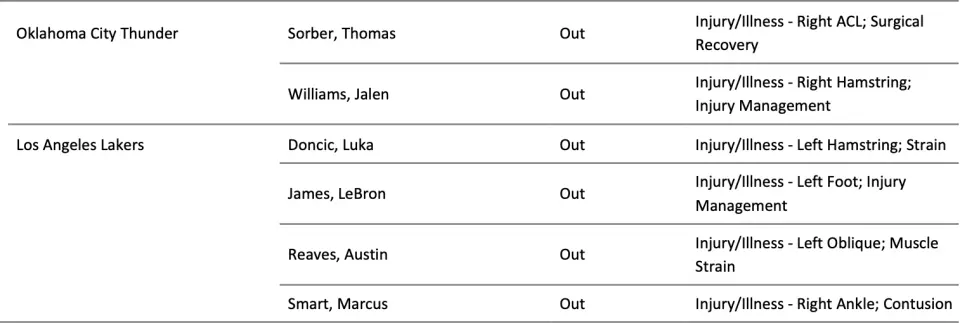 除此之外,里夫斯(左侧腹斜肌拉伤)、斯马特(右脚踝挫伤)、詹姆斯(左脚伤病管理)和海斯(左脚酸疼)均因伤缺席本场比赛。