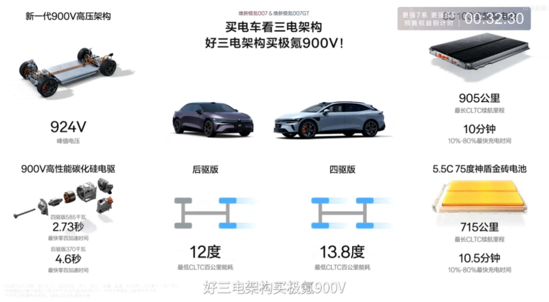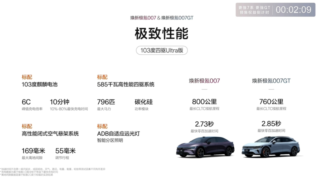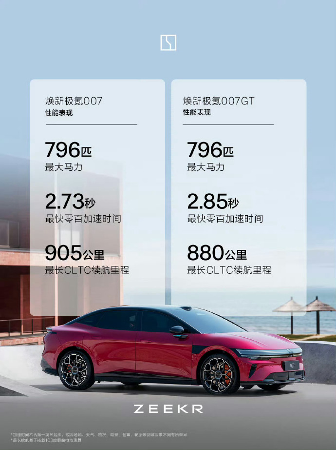 4月10日,极氪汽车在杭州举办"超级产品日"发布会,焕新极氪007与焕新极氪007GT正式上市,权益后限时售价19.39-23.39万元。两款新车基于900V高压架构打造,搭载麒麟电池,最高CLTC续航达905公里,四驱版百公里加速最快仅需2.73秒,以"性能+续航"双核心优势重新定义20万级纯电车型性能天花板。