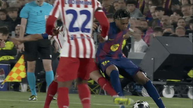 比赛初段,马竞队长科克就曾对佩德里犯规未吃牌,第 30 分钟,他则因对奥尔莫犯规吃到本场第一张黄牌。