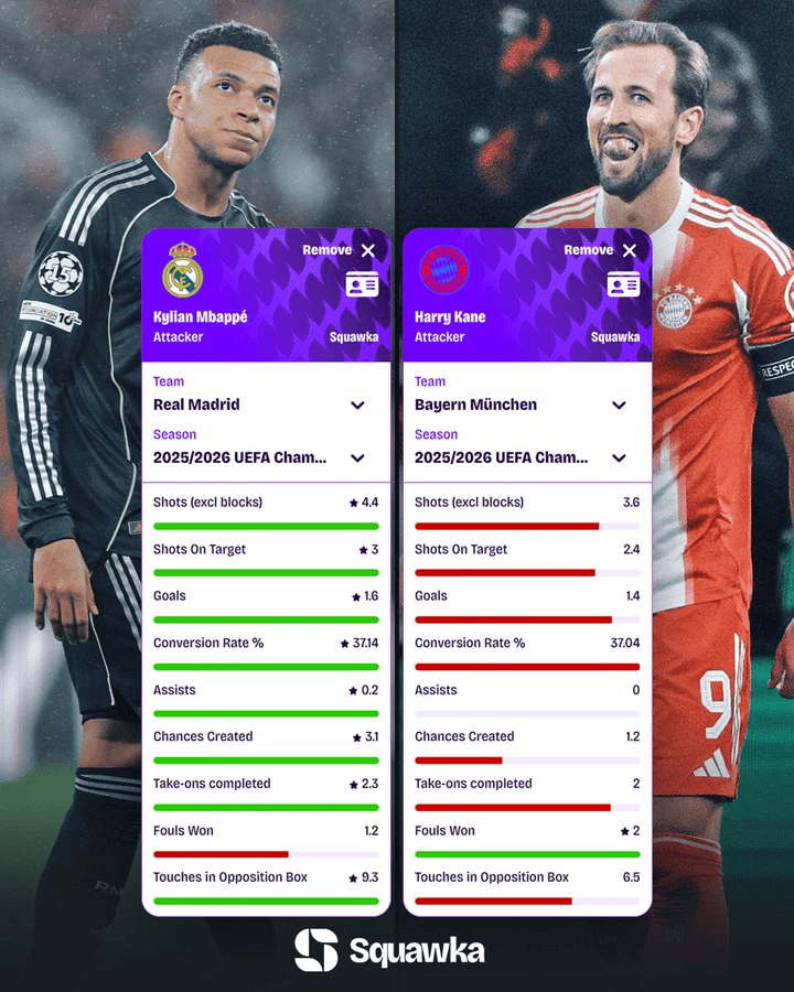 虎扑04月07日讯 Squawka统计了姆巴佩和凯恩本赛季在欧冠联赛每90分钟的数据,详情如下: