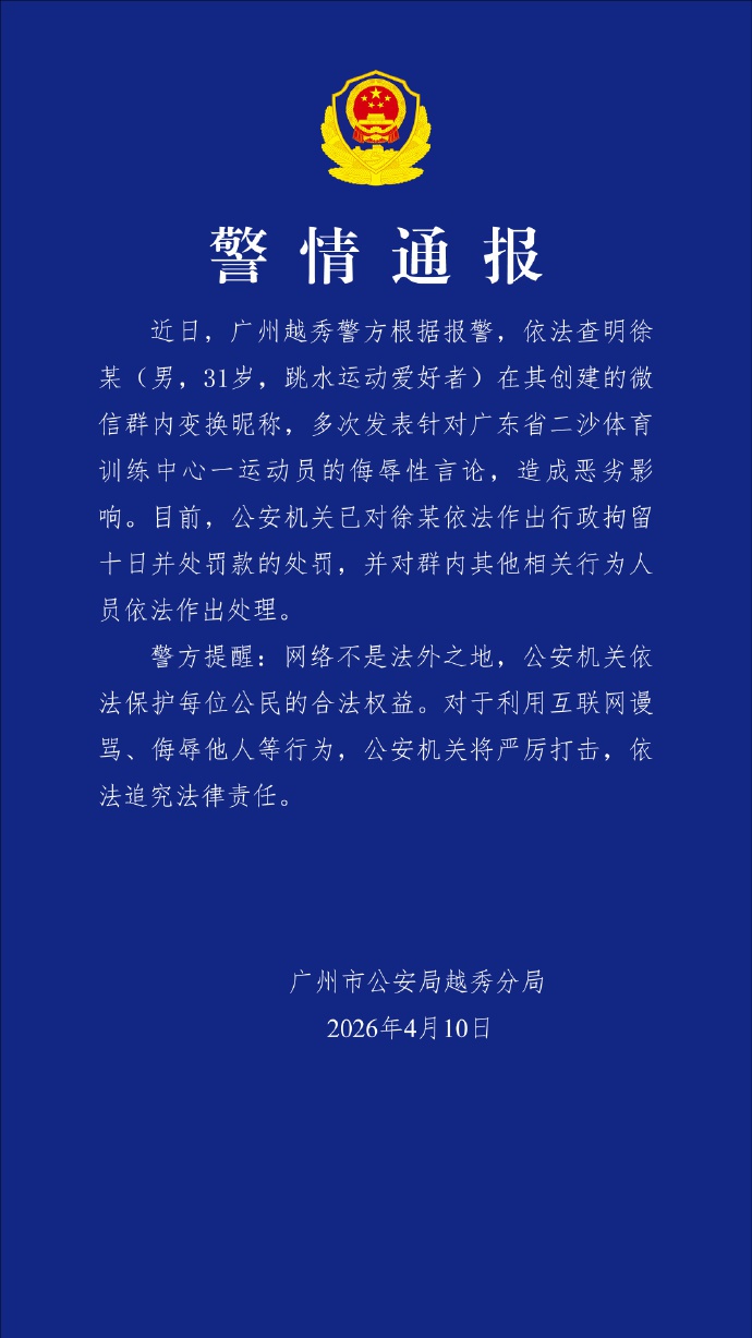近日,广州越秀警方根据报警,依法查明徐某(男,31岁,跳水运动爱好者)在其创建的微信群内变换昵称,多次发表针对广东省二沙体育训练中心一运动员的侮辱性言论,造成恶劣影响。