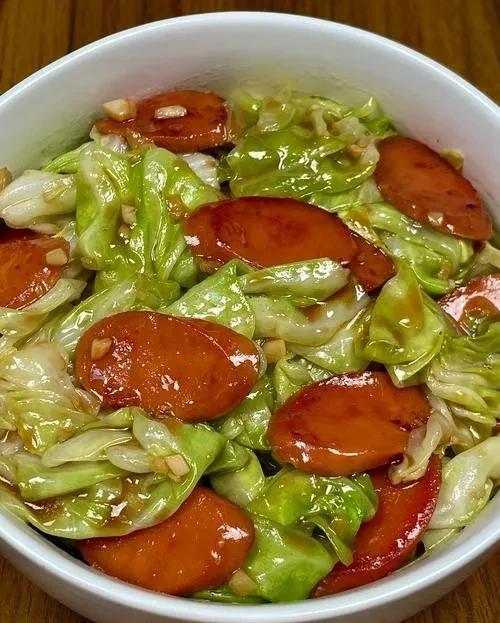 7. 翻炒至熟:继续翻炒包菜和火腿肠,直到包菜变软且均匀入味,火腿肠也完全熟透。可以根据需要稍加一点水,防止菜变干。