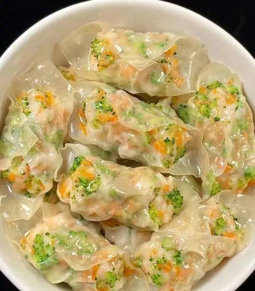 3、接着把西兰花碎、胡萝卜碎和虾滑一起抓拌均匀,然后用馄饨皮包起来,再上蒸锅蒸煮。