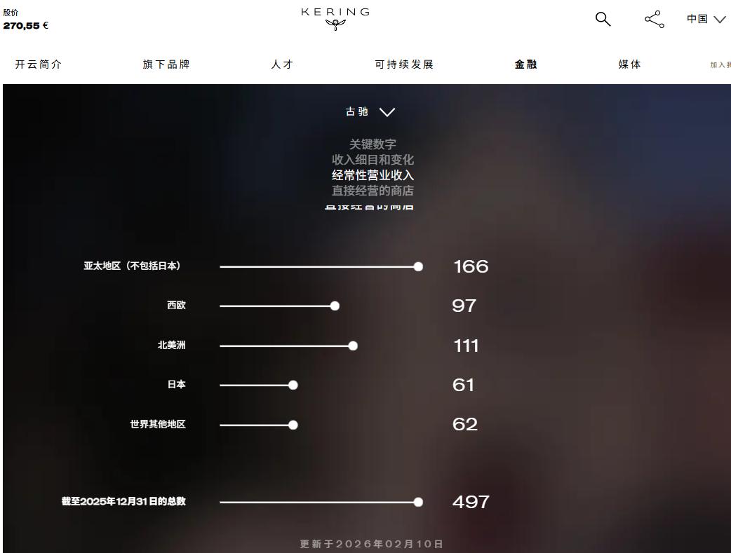 截至2月10日,GUCCI的全球门店数是497家。其中,亚太地区(不含日本)共有166家,占比超3成,是GUCCI全球门店数最多的区域。