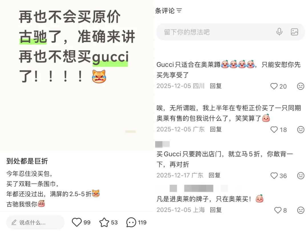 在小红书平台,除了有网友惊叹GUCCI的2.5折高折扣,还有人求助:“专柜买回来的GUCCI外套,还没拆吊牌就进奥莱,损失的8500元该怎么办?”