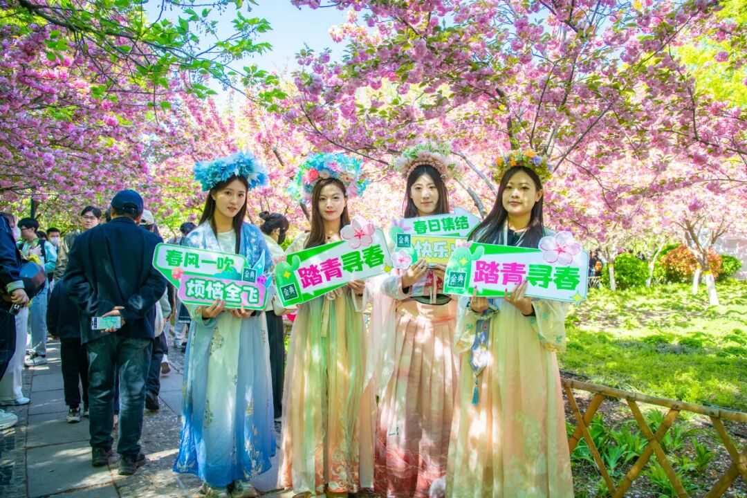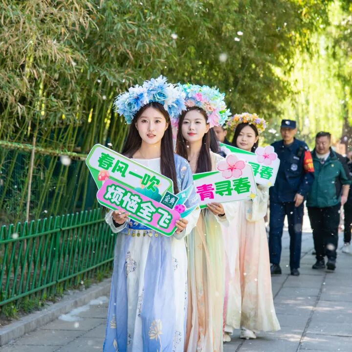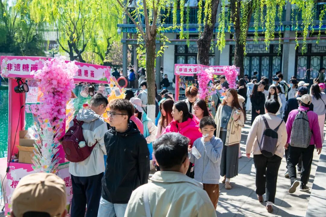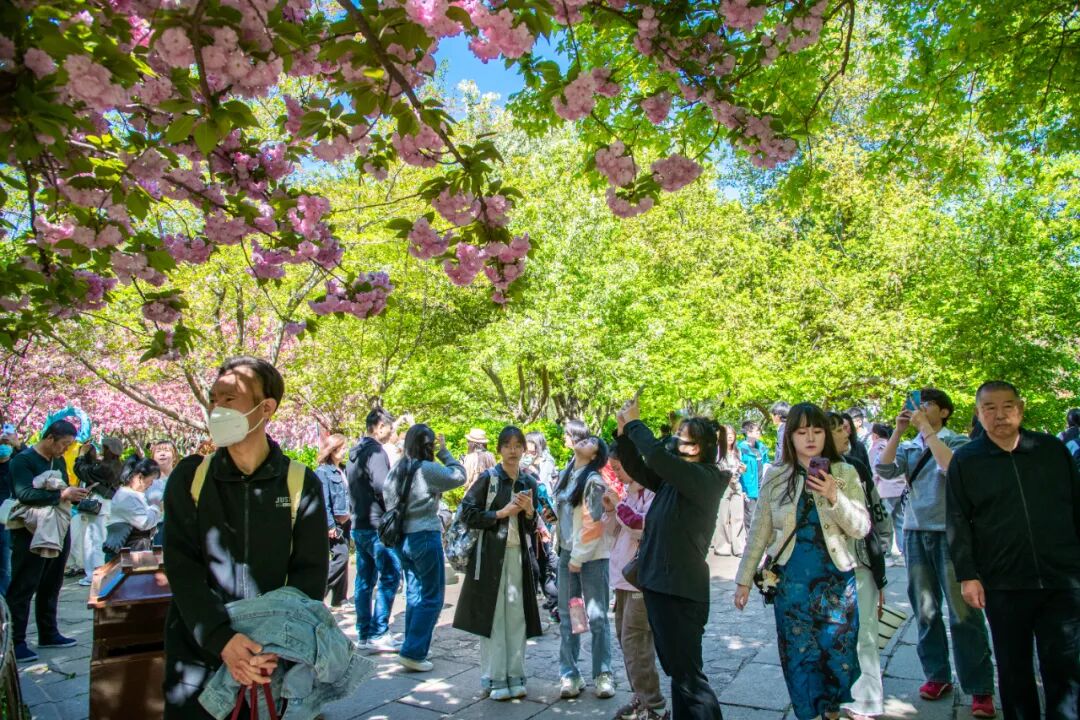 作为春日打卡胜地,五龙潭公园一派热闹景象。第二十三届樱花节正在火热进行中,樱花海棠缀满枝头,与清泉、古建相映成趣,吸引游客驻足拍照。