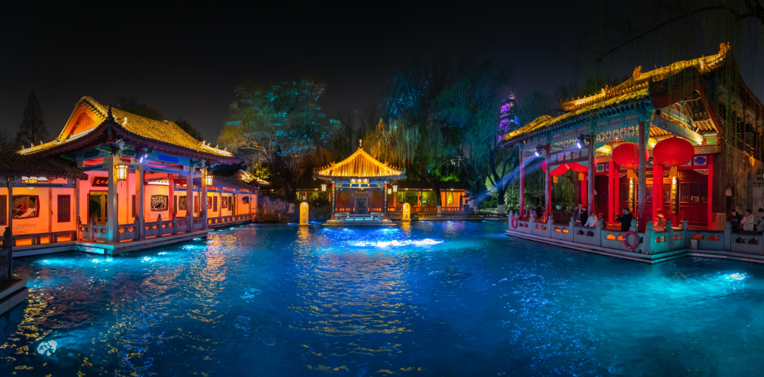白日游泉赏花,夜晚赴宴入画。假期期间,天下第一泉风景区两大王牌演艺齐发力。趵突泉夜游《趵突夜画》每晚20点如约守候,以光为笔、以音为墨,深挖“二安”文化精髓,融合光影秀与NPC互动,让千年泉脉在夜色中焕发新生。