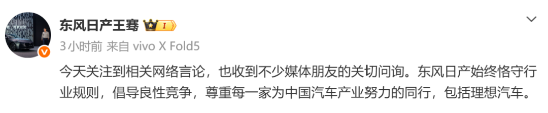 据界面新闻,4月11日傍晚,东风日产汽车销售有限公司新能源品牌总经理王骞在社交媒体平台发文:今天关注到相关网络言论,也收到不少媒体朋友的关切问询。东风日产始终恪守行业规则,倡导良性竞争,尊重每一家为中国汽车产业努力的同行,包括理想汽车。