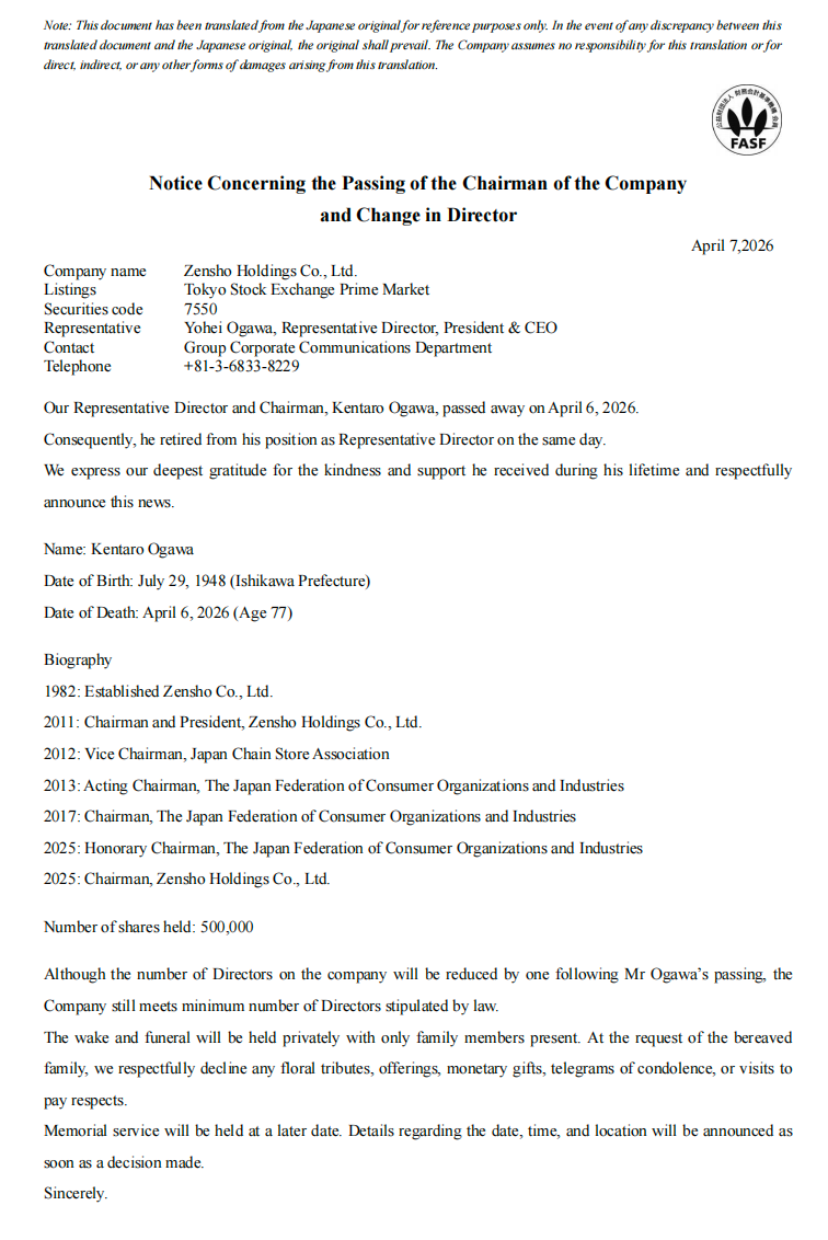4月7日,日本餐饮巨头泉膳控股(Zensho Holdings)发布公告称,公司创办人兼会长小川贤太郎(Kentaro Ogawa)于2026年4月6日逝世,享年77岁。其职务随之于同日自动解除。据媒体报道,小川贤太郎离世原因为心肌梗塞。