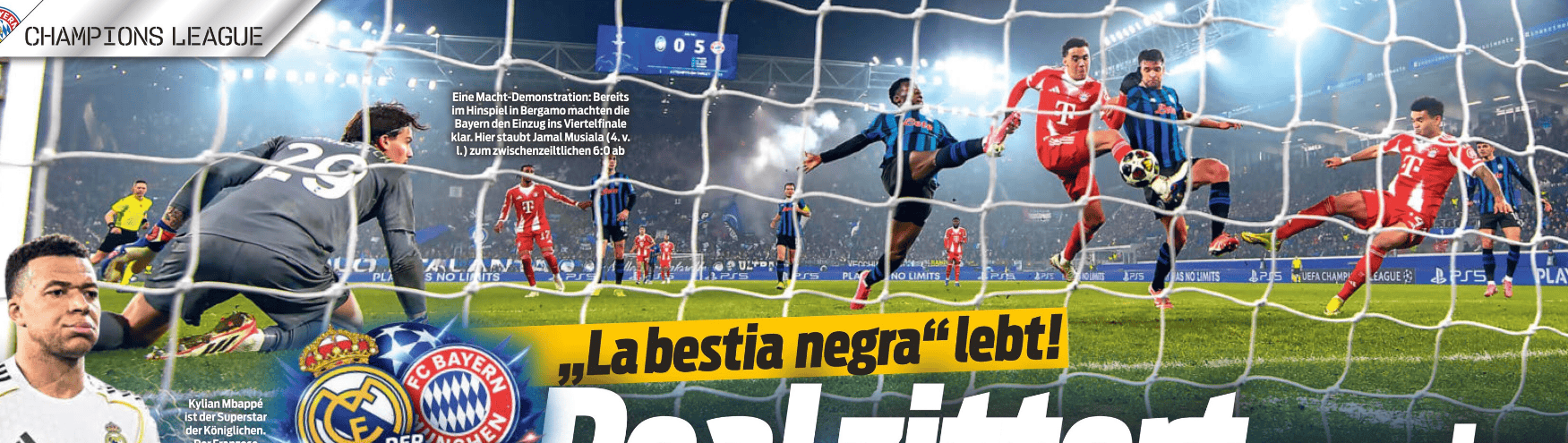 皇家马德里在拜仁慕尼黑面前瑟瑟发抖。意大利人被德甲领头羊彻底击溃。此前,亚特兰大本赛季主场比赛中只有两场丢球超过两球:联赛0-3负于萨索洛,以及欧冠2-3负于毕尔巴鄂竞技。首回合在贝加莫进行的比赛中,拜仁慕尼黑开场仅25分钟就以3-0领先,最终以6-1大胜。
