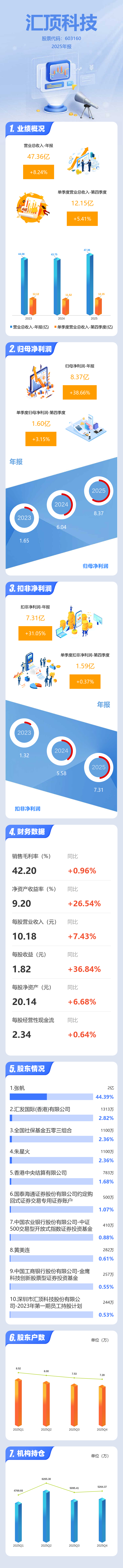证券之星消息,汇顶科技2025年年报显示,当年度公司主营收入47.36亿元,同比上升8.24%;归母净利润8.37亿元,同比上升38.66%;扣非净利润7.31亿元,同比上升31.05%;其中2025年第四季度,公司单季度主营收入12.15亿元,同比上升5.42%;单季度归母净利润1.6亿元,同比上升3.15%;单季度扣非净利润1.59亿元,同比上升0.37%;负债率15.24%,投资收益1.05亿元,财务费用-1.09亿元,毛利率42.2%。