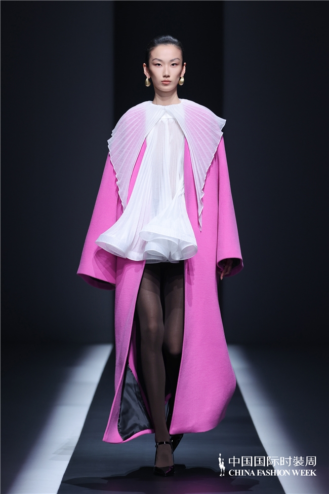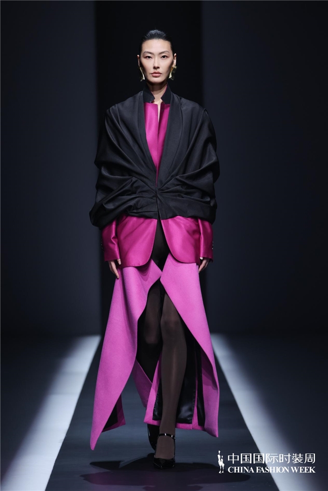 秀场之上,灯光渐亮、旋律奏响,模特身着玫粉色长款大衣,搭配压褶工艺打造的白色花瓣裙优雅登场,将“我”对世界最初的懵懂感知,悄然藏于衣物肌理之中;随着旋律鼓点逐渐加重,象征着成长历程的推进,服装色彩从明艳热烈的玫粉,渐变为低调内敛的炭灰、中灰与浅灰蓝。颈部缠绕的线条、肩部利落的轮廓、胯部扩张的结构、衣身斜向交错的剪裁,生动勾勒出成长路上和谐与冲突共生的状态;最终,以克制沉稳的酒红色调、舒展自在的服装造型,呈现出当下“我”对世界的成熟理解与全新感知。此外,设计师宋双以独特的设计语言,重新演绎16世纪拉夫领与中世纪欧洲裙撑经典元素,融合建筑美学结构特点,打造出极具空气感的造型,成为秀场一大亮点。