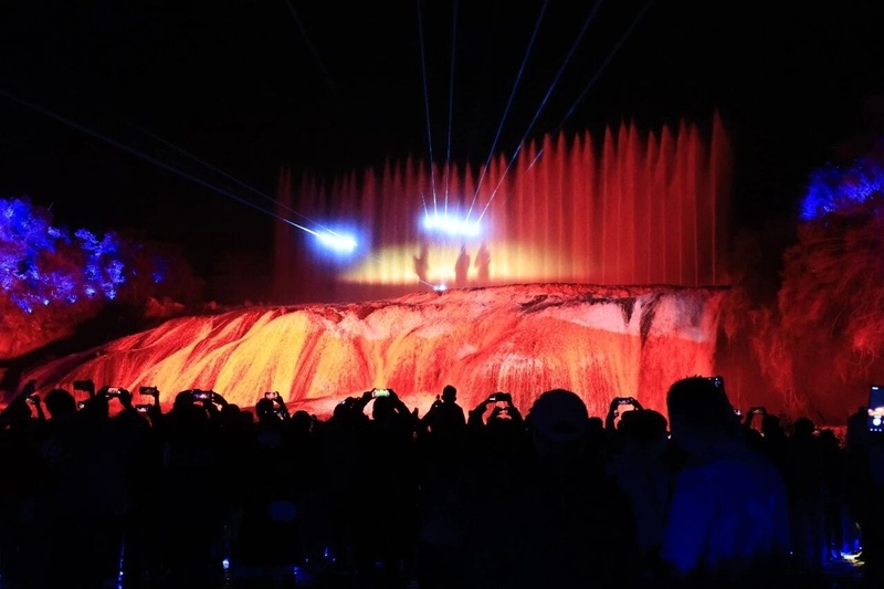 《再回西游》以86版《西游记》为核心,将经典神话传说与瀑布奇景、峡谷自然风光深度融合。炫美灯光勾勒出瀑布雄奇轮廓,前沿声光电技术生动演绎取经路上一幕幕经典场景,让游客宛若置身如梦似幻的西游秘境。当前,“白天观瀑布、夜晚赏光影”已成为黄果树旅游新风尚,2025年景区夜间收入占比突破30%。