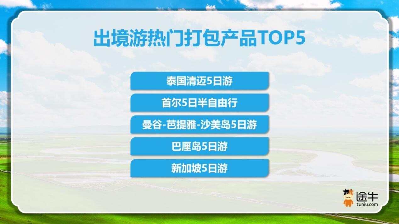 产品形态上,据途牛介绍,5天行程的打包产品持续走热,如“泰国清迈5日游”“首尔5日半自由行”“巴厘岛5日游”等,兼顾观光体验与海滨休闲,成为热门之选。
