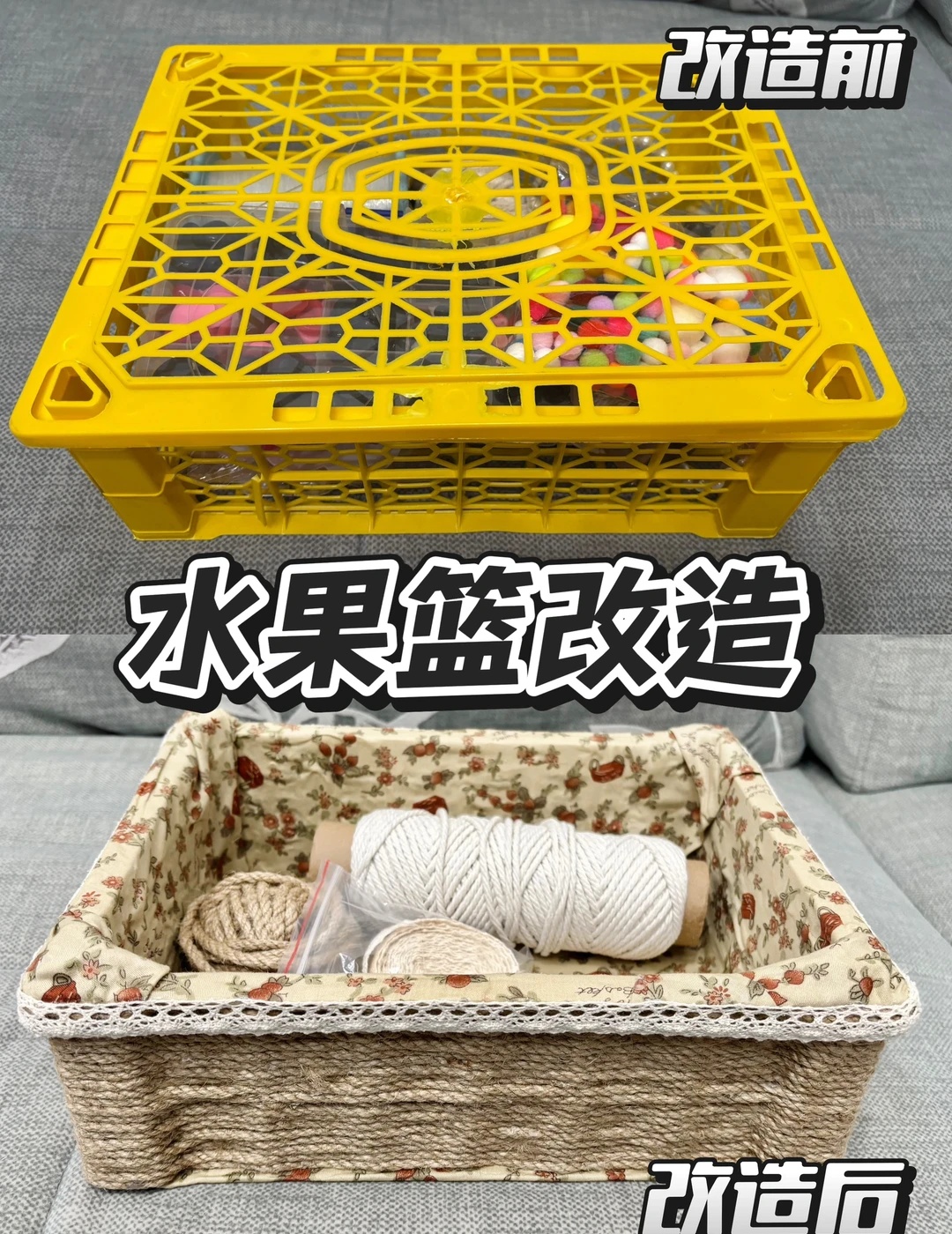 如果是大一点的水果筐,同样也可以改造,用家里的碎花布,还有麻绳简单几步,就变成了高颜值的收纳筐,用热熔胶将花布和麻绳包裹在水果筐外面就可以了。