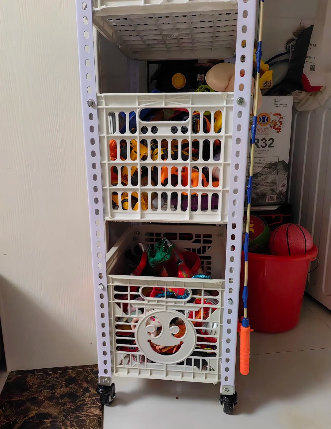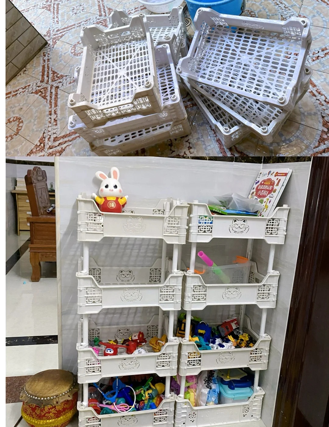 买水果的时候就将这些水果筐全都积攒下来,刷洗干净就可以用来收纳玩具了,容量特别大,玩具可以通通的放在里面,而且还可以叠放。