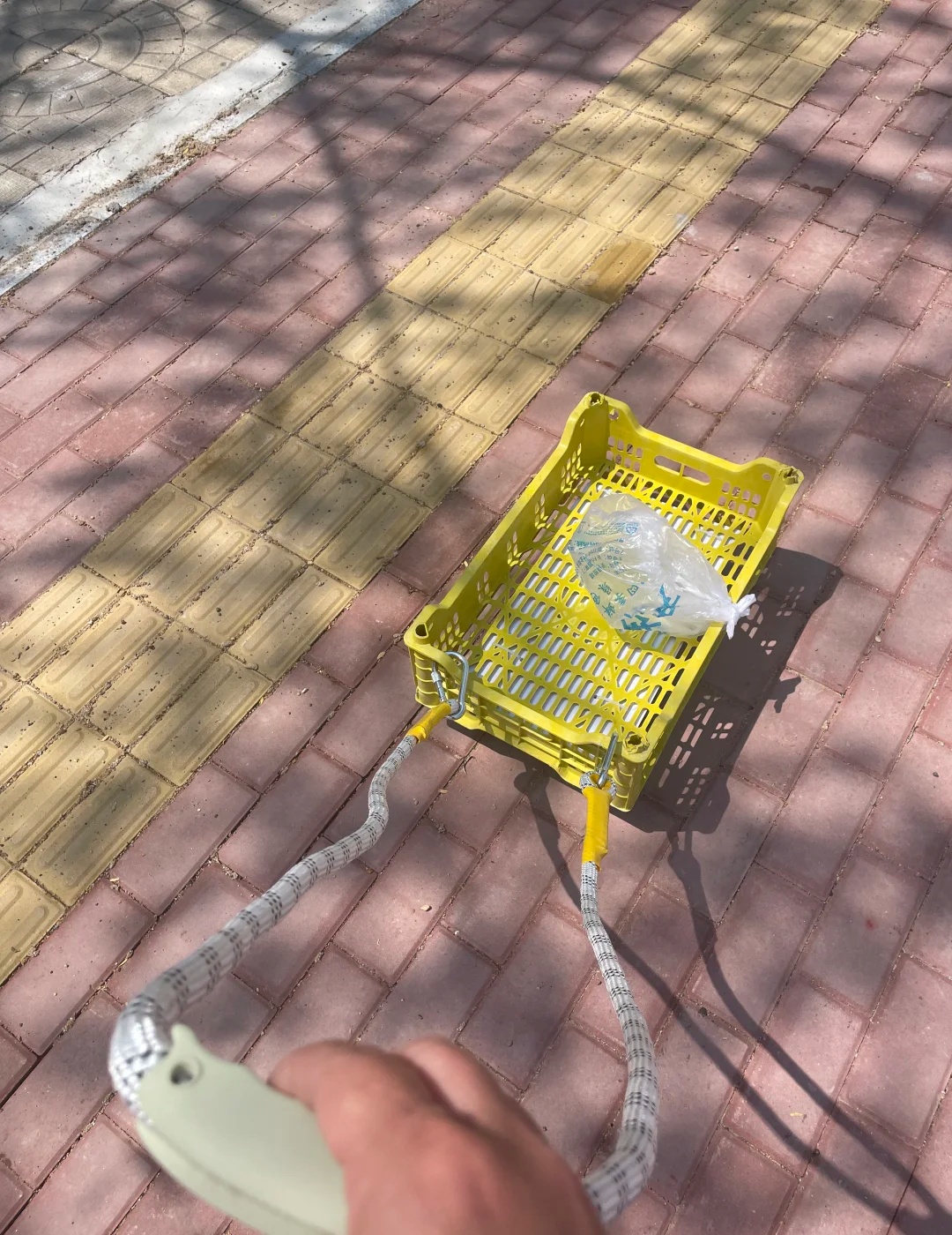 然后在合适的地方拴上把手,遛狗绳或者是家里不用的丝带,固定在水果筐边上,这样拉着就可以走了,特别重的快递放在里面会很省力。