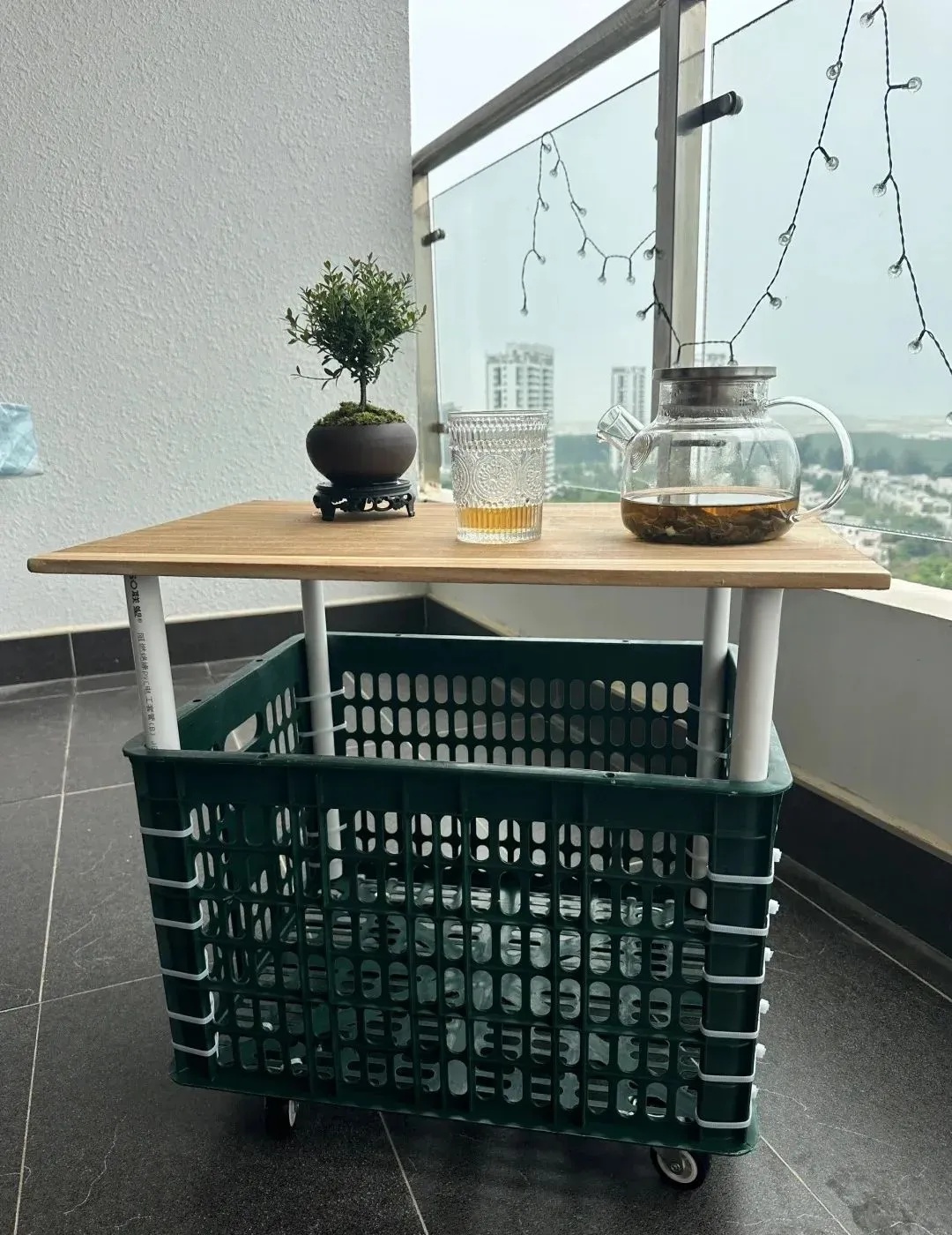 利用一个闲置不用的水果筐,改造一个可以移动的小茶几,整个成本30元就搞定,在家里喝茶就方便多了,可以来回移动,而且水果筐还带有储物功能。