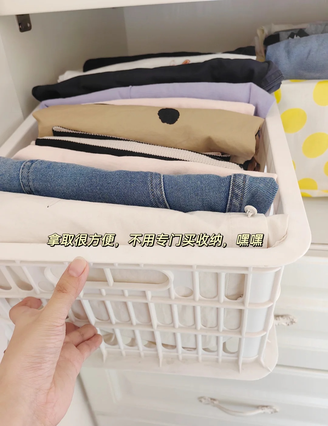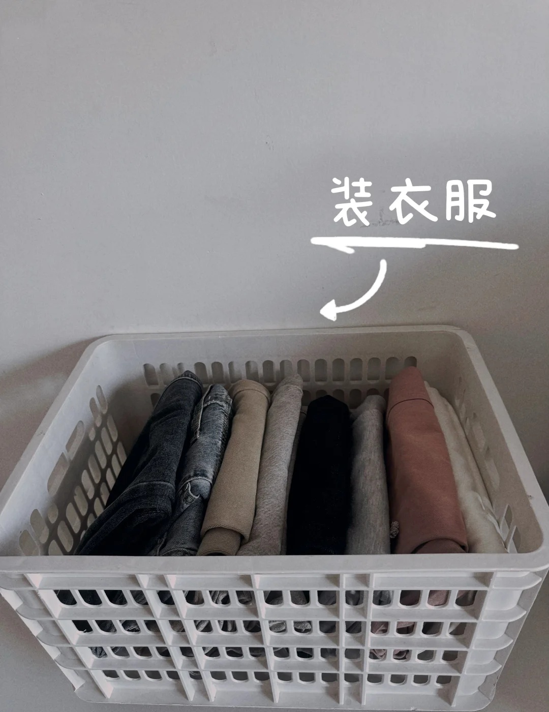 这种白色的水果框,本身存在感就不强,刷洗干净之后就可以用来收纳衣服,衣服叠整齐放在里面,翻找后也不会变乱。