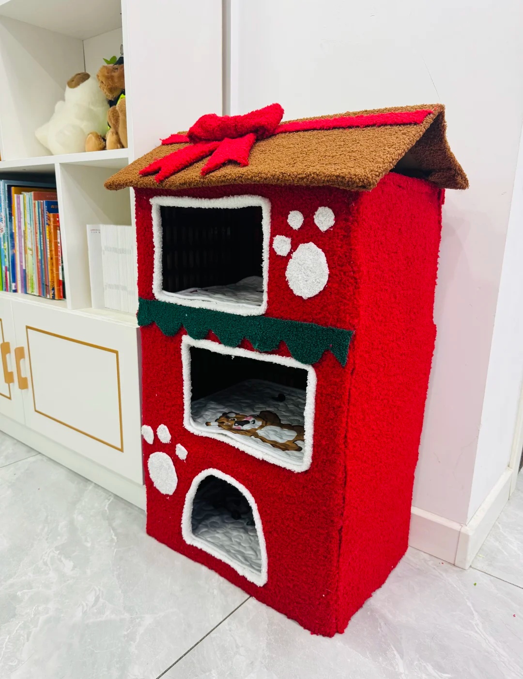 然后把纸板包裹在水果筐的外部。再将猫抓绒布用热熔胶固定在纸板上面就可以了,在最上面再用纸板搭建一个屋顶,这样一个好看的三层大house猫窝就做好了。