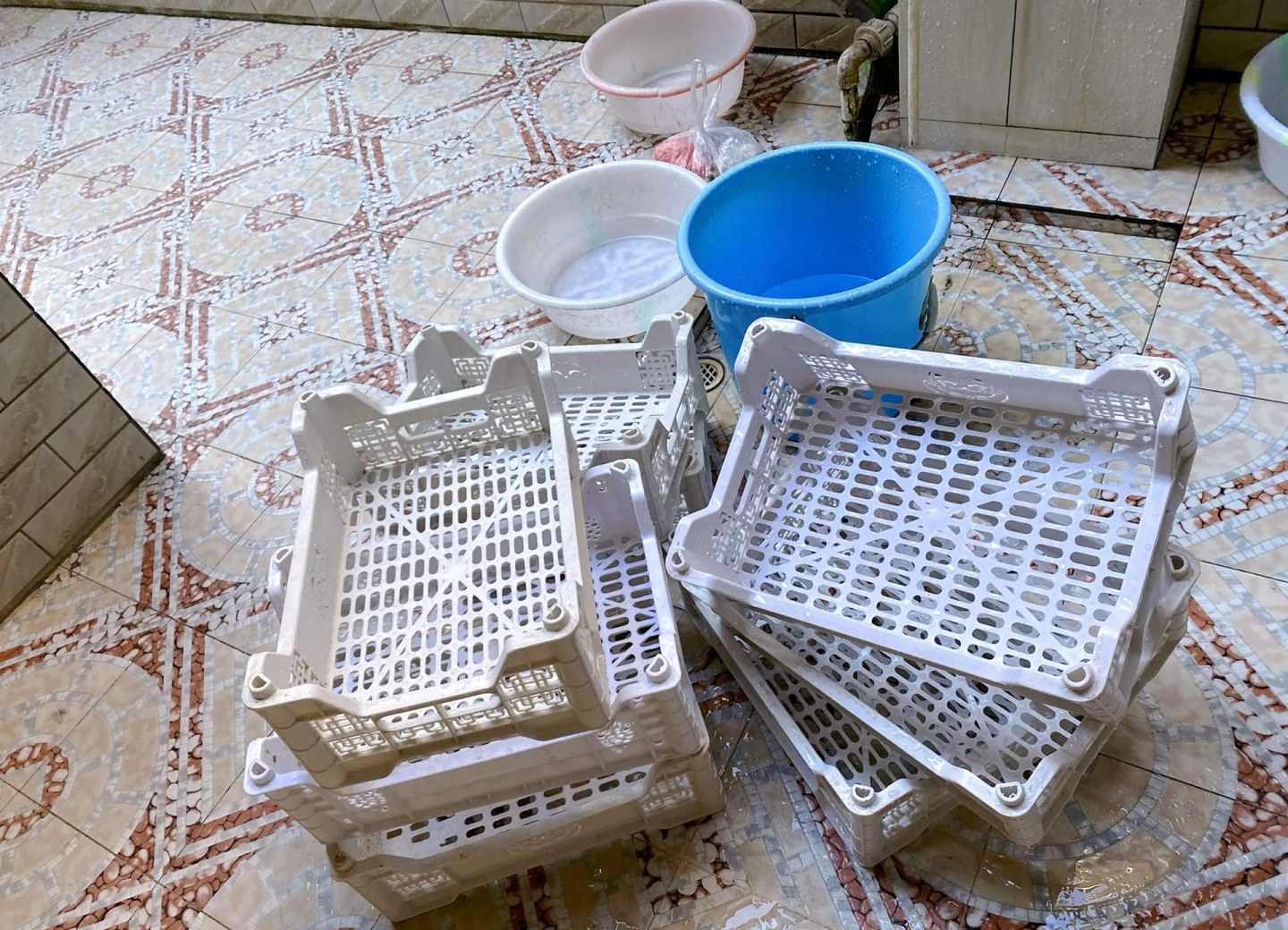挑品相好一点的,刷洗干净,然后把侧面中间的位置掏空,然后将水果筐全部都叠加放在一起,就变成了一个鞋子收纳架。