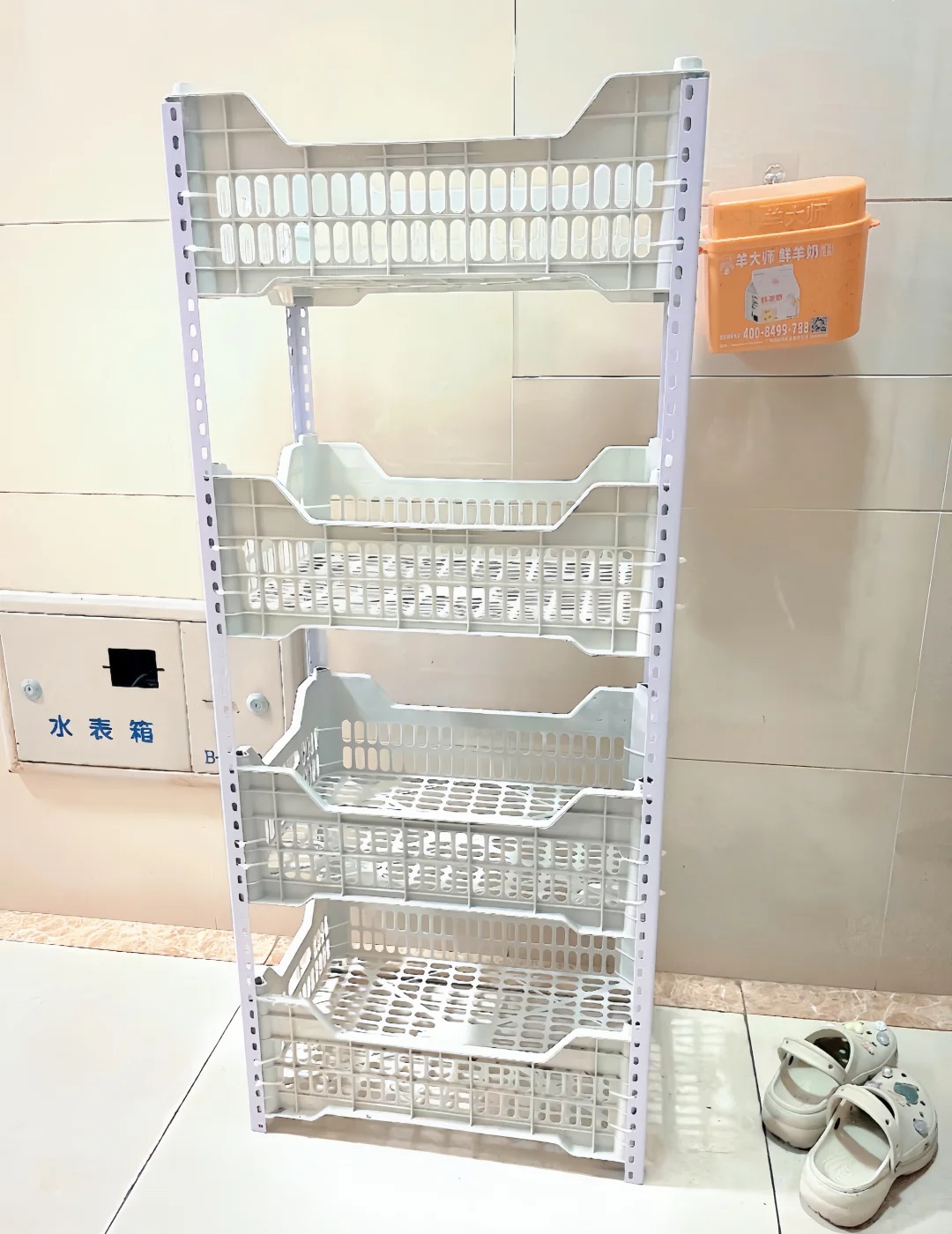 将水果筐连接在一起就可以了。这样就变成了一个可以任意diy的置物架,一般三层4层就已经足够使用了,放在家里能够用来收纳孩子的玩具,以及家里零碎的小物件,也可以当做零食收纳筐。