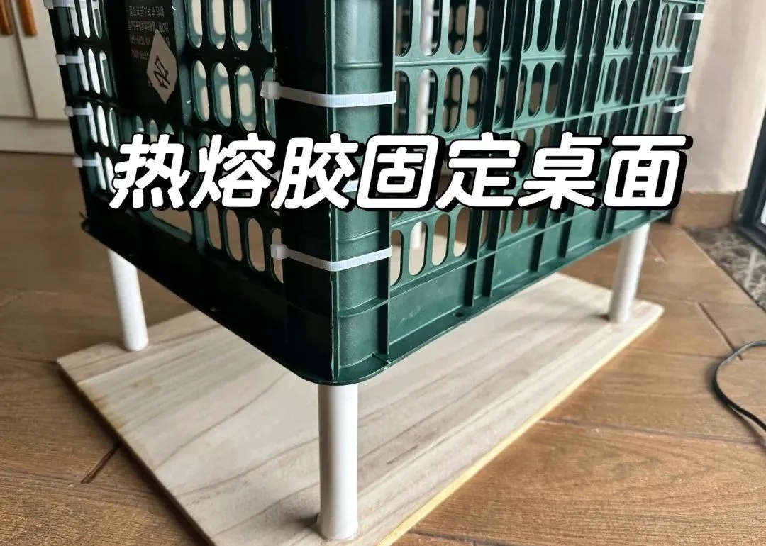 使用pvc管固定在水果筐的4个内角里面,然后使用扎带绑紧。找了一个不要的木板做桌面,家里装修的时候剩下的木板就可以,