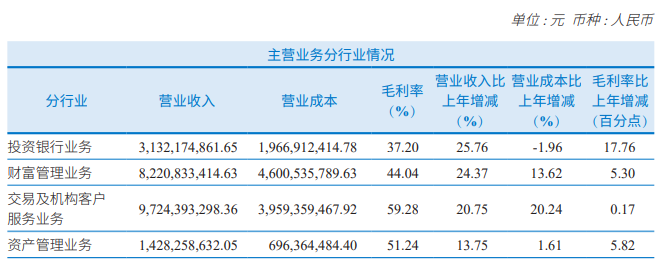 具体到各项主营业务上,规模方面,2025年中信建投的交易及机构客户服务业务营收贡献最多,达到97.24亿元。财富管理业务板块的营业收入紧随其后,合计82.21亿元。