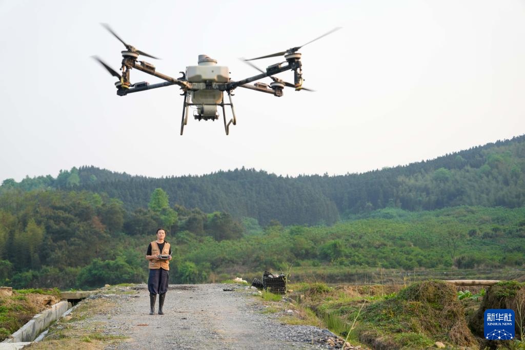 4月9日,骆雨在华塘镇的田间操作无人机喷施农药。