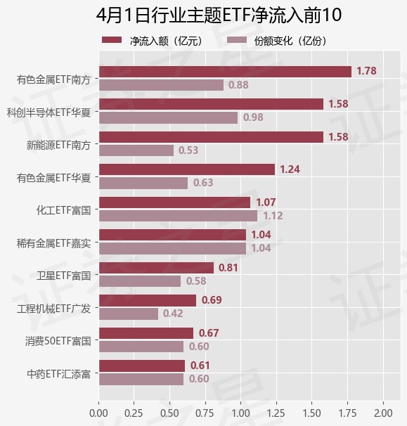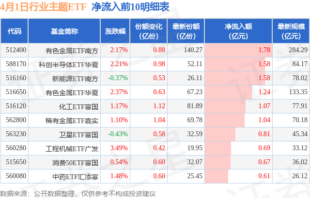 当日有95只行业主题ETF基金出现资金净流入,其中净流入排首位的是有色金属ETF南方(512400),份额增加了8800.0万份,净流入额为1.78亿元。
