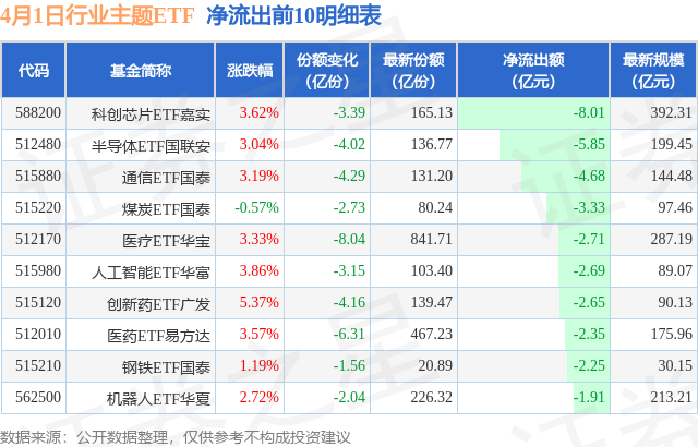 当日有159只行业主题ETF基金出现资金净流出,其中净流出排首位的是科创芯片ETF嘉实(588200),份额减少了3.39亿份,净流出额为8.01亿元。