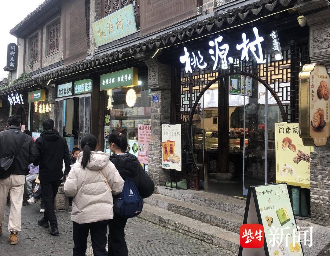 尽管是工作日,老门东历史文化街区依然游人如织。位于三条营的“桃源村”门店古色古香,“中华老字号”的牌匾高悬门头,寓意吉祥的“平安糕”被摆放在显眼位置。