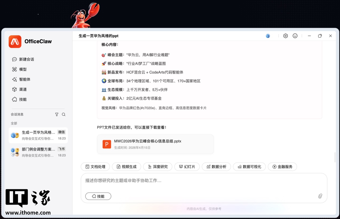 IT之家 4 月 16 日消息,华为云今日举行 OfficeClaw 办公智能体新品体验会,发布了自研龙虾办公智能体 OfficeClaw,华为云官网将于每天 10 点限量发放邀请码。