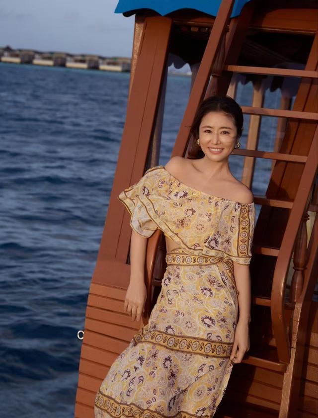 这套海边造型氛围感拉满,林心如上身一件黄棕调异域风露肩长裙,一字肩设计可以完美展露肩颈线条,衬得天鹅颈修长优雅,弱化了年龄感,还可以尽显女性柔美。裙身的复古印花则自带浓郁的异域风情,暖黄底色温柔显白,搭配多层复古纹样镶边,层次感拉满,高级感十足。