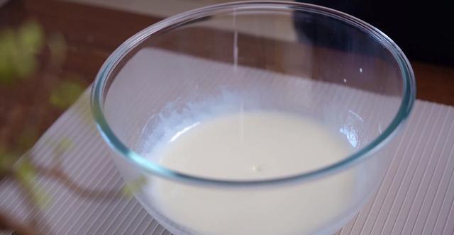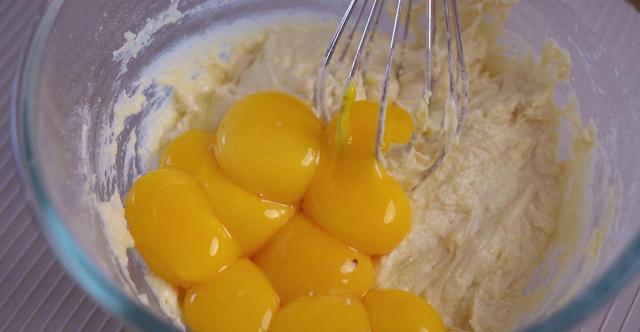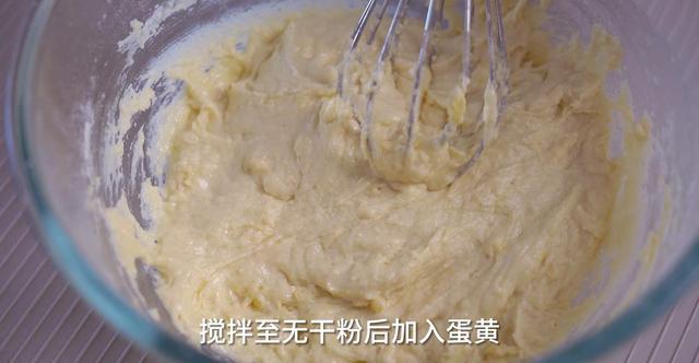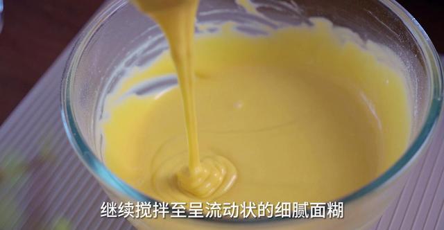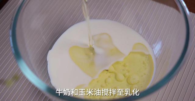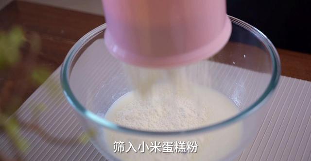 2、玉米油和牛奶搅拌至乳化(乳化好之后呈现的是酸奶状,这一步很关键,一定要做到位),筛入小米蛋糕粉搅拌到无干粉,加入蛋黄继续搅拌到有流动性的面糊。