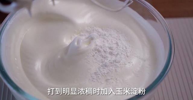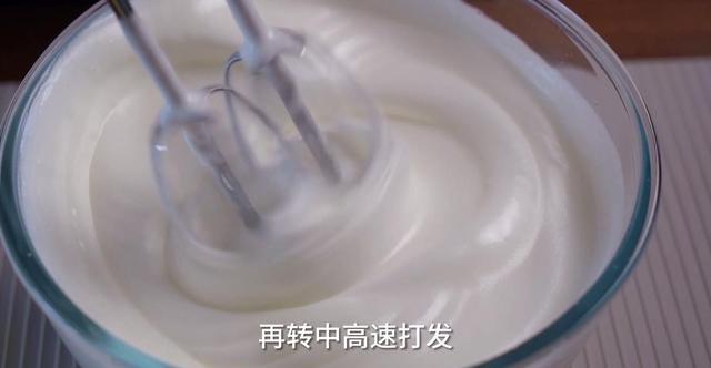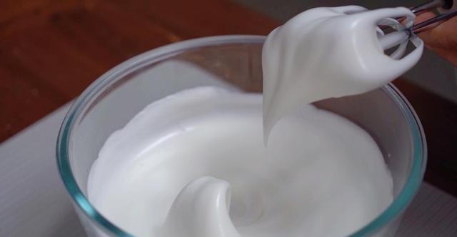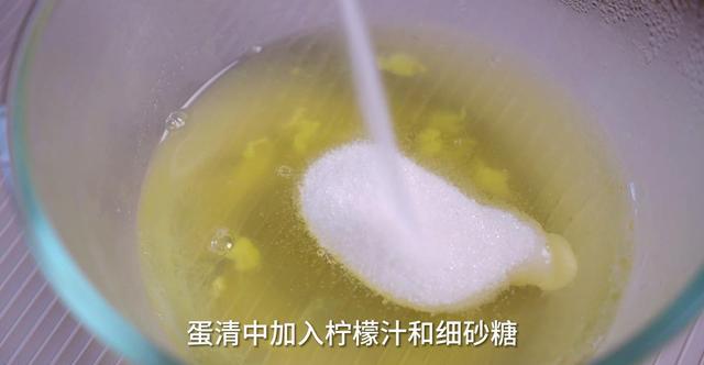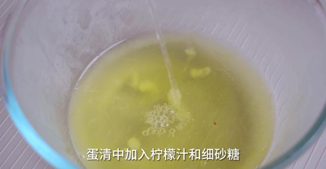 3、打发蛋清。把柠檬汁和细砂糖加入到蛋清中,用电动打蛋器先低速打散,再转中高速打发,打到明显浓稠再转低速整理,打到提起蛋抽出现鹰嘴弯勾即可。
