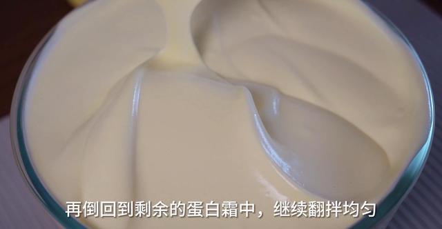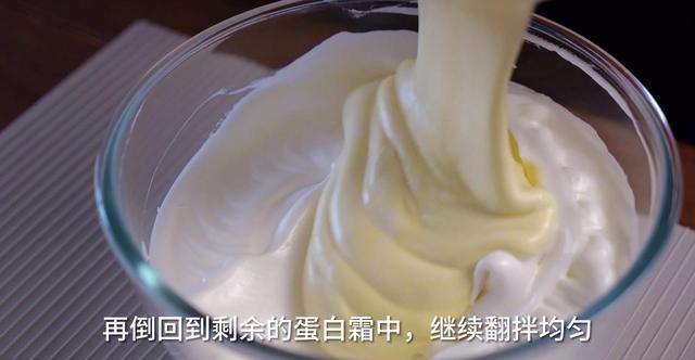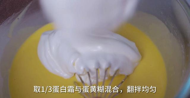 4、先将1/3蛋白与蛋黄糊混合拌匀,然后再倒回到剩余的蛋白中,继续翻拌均匀。倒入烤盘中(28*28*3的方盘)。