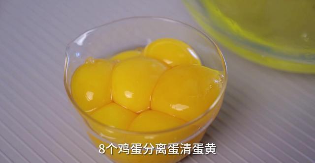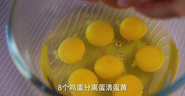 1、8个鸡蛋分离蛋清蛋黄,冷冻蛋清至四边有冰碴儿(这样打发更稳定)。