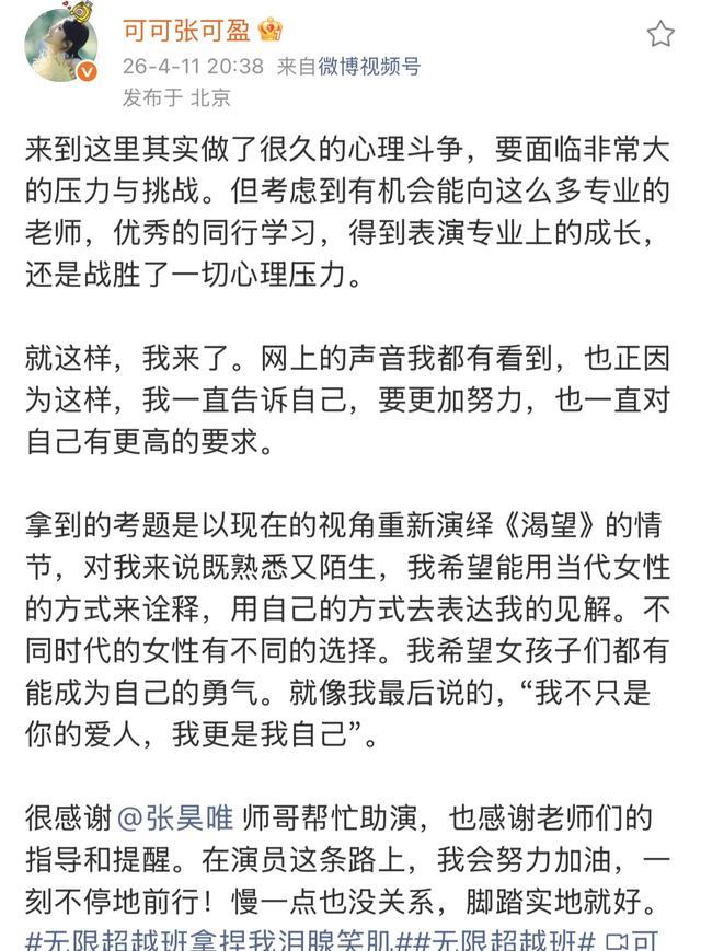 这次参加《无限超越班》,张可盈也表示自己是做了很久的心理斗争,要面临非常大的压力与挑战,但考虑到有机会能向这么多专业的老师,优秀的同行学习,得到表演专业上的成长,还是战胜了一切心理压力。“在演员这条路上,我会努力加油,一刻不停地前行!慢一点也没关系,脚踏实地就好”。