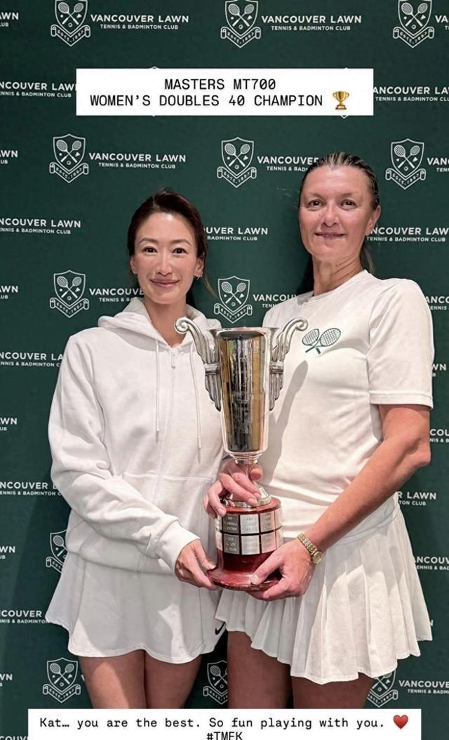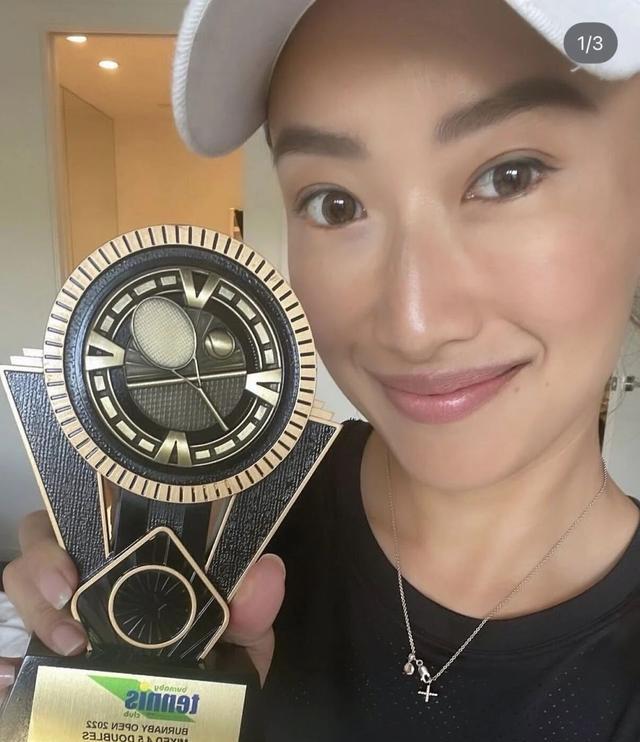 谢婷婷对网球的热爱与执着,早已刻进日常。早在13岁前往加拿大求学时,她便系统接触网球,加入校队参与各类赛事,打下了扎实的基础,即便后来回香港发展演艺事业,也始终没有放弃这份爱好,坚持每周训练。定居加拿大后,她更是将大量时间投入网球运动,2023年拿下温哥华某网球俱乐部双打冠军,2024年斩获加拿大网球赛事40岁组别单打冠军,战绩稳步提升。