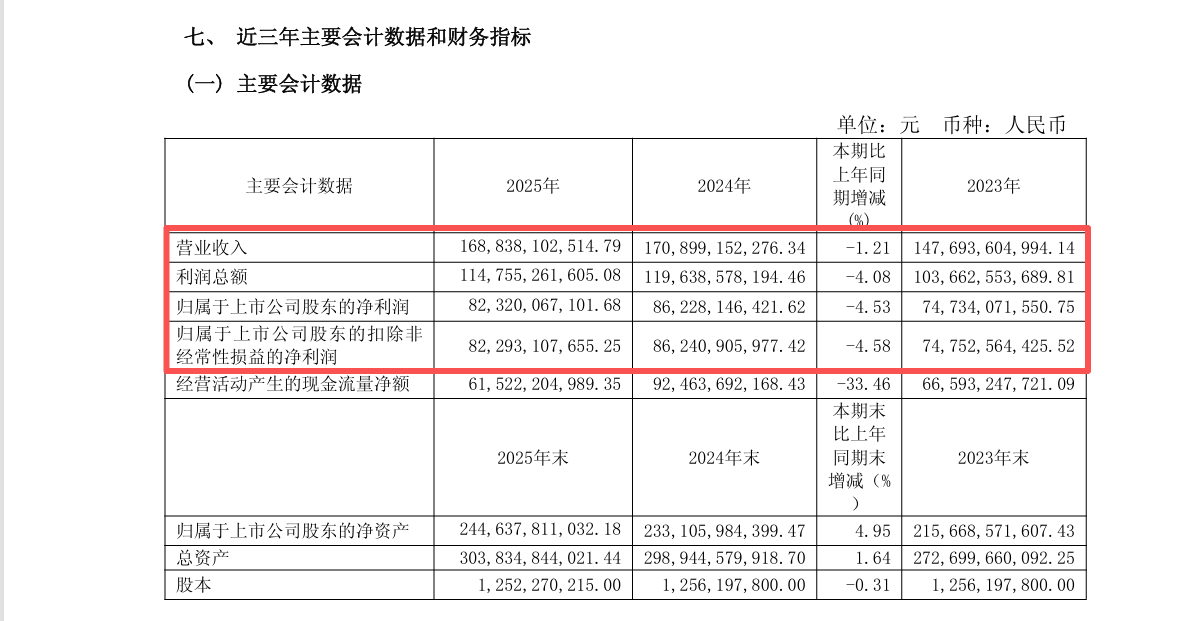 贵州茅台上市以来,业绩首次出现下滑。4月16日晚,贵州茅台酒股份有限公司(简称“贵州茅台”)披露的2025年年度报告显示,去年实现营业收入1688.38亿元,同比下降1.21%;归属于上市公司股东的净利润为823.20亿元,同比下降4.53%。