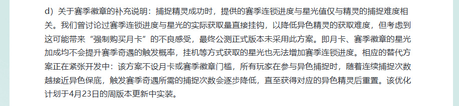 与此同时,核心的异色机制也做了说明。当玩家连续抓同一种精灵、次数越来越接近“保底”必出时,触发稀有事件所需的捕捉次数会逐步减少,直到玩家抓到那只稀有精灵为止,之后重新计算。无论玩家买不买月卡、有没有拿到赛季奖励,都不会影响遇到稀有精灵的概率;靠挂机自动获得的运气值,也不会帮玩家更快遇到稀有精灵。