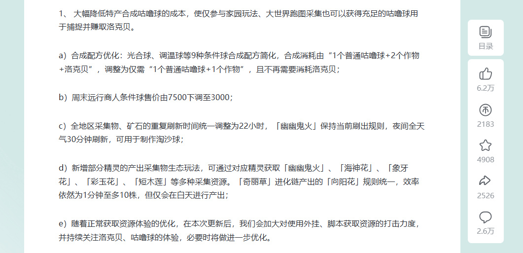 “刷宠”被视为游戏中增加日活和活跃度的有效办法,玩家对宠物的执着可以增加其游戏时长。但这一次,官方主动降低了捕捉门槛。把公告里的内容翻译成人话,就是制作咕噜球更省材料了、买咕噜球更便宜了、资源刷新时间更规律了,还多了几种从动物身上获得的资源。
