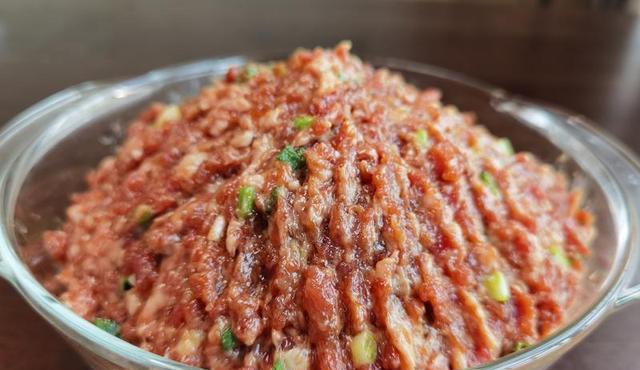 2.肥七瘦三的五花肉给他剁碎。然后在里面加入葱姜去腥。放生抽老抽精盐调味。接下来再往里面加入13香和五香粉。用筷子给它搅拌均匀。