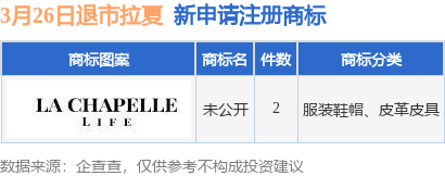 证券之星消息,根据天眼查APP数据显示,近日上海拉夏贝尔服饰股份有限公司新提交“未公开”等2件商标注册申请。商标申请详情如下: