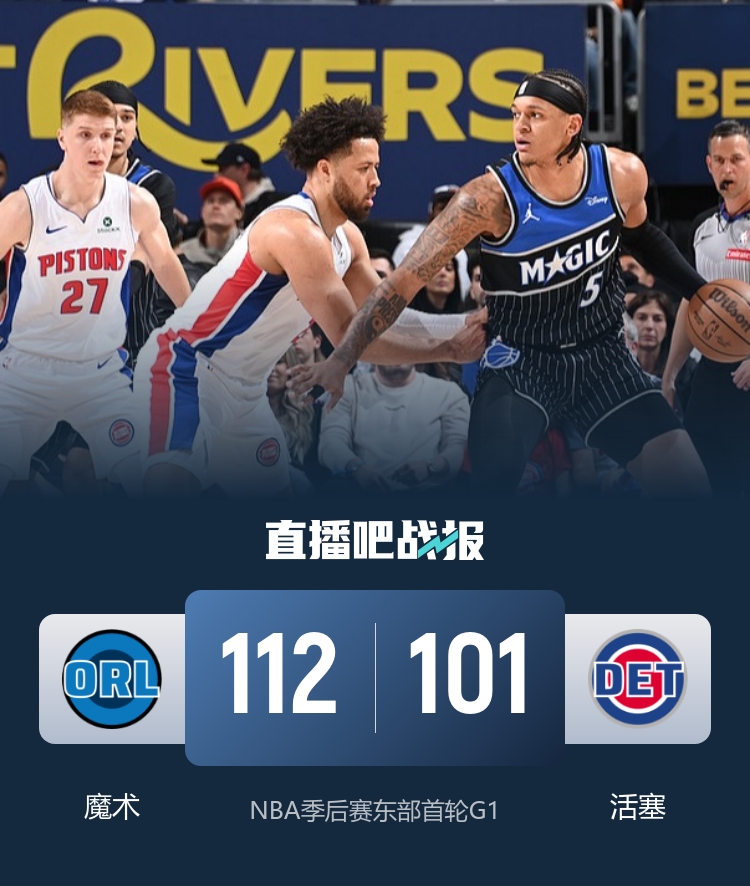 比赛开始,双方开场短暂相持,魔术持续发力打出15-2的攻击波确立两位数优势,坎宁安连投带罚拿分追赶,比塔泽补扣得手稳住局势,次节两队继续缠斗,活塞轮番冲击内线得手迫近比分,坎宁安反击一度追到1分,半场战罢魔术55-51领先活塞。次节上来,双方依旧打得难解难分,坎宁安高效输出,魔术轰出9-0的攻击波重获两位数领先,末节小瓦格纳攻防两端发力率队保持优势,贝恩中投命中,魔术稳扎稳打保持优势,活塞苦苦追赶无果。最终,魔术112-101击败活塞,取得1-0的领先。