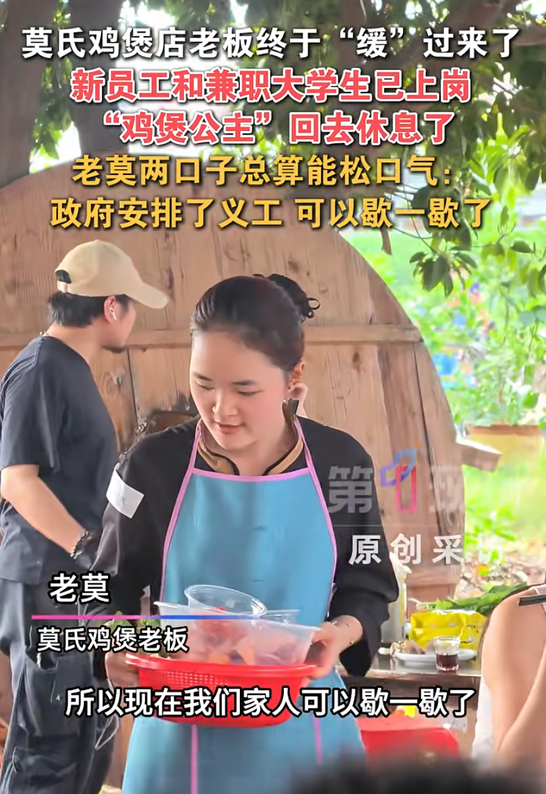 4月9日,第一现场记者探访莫氏鸡煲,老板终于缓过来了,记者在店里看到了招聘的新员工和兼职的大学生已经上岗,老莫说当地政府安排了许多义工来帮忙,终于可以歇一歇,“鸡煲公主”可以喘口气回去休息了。