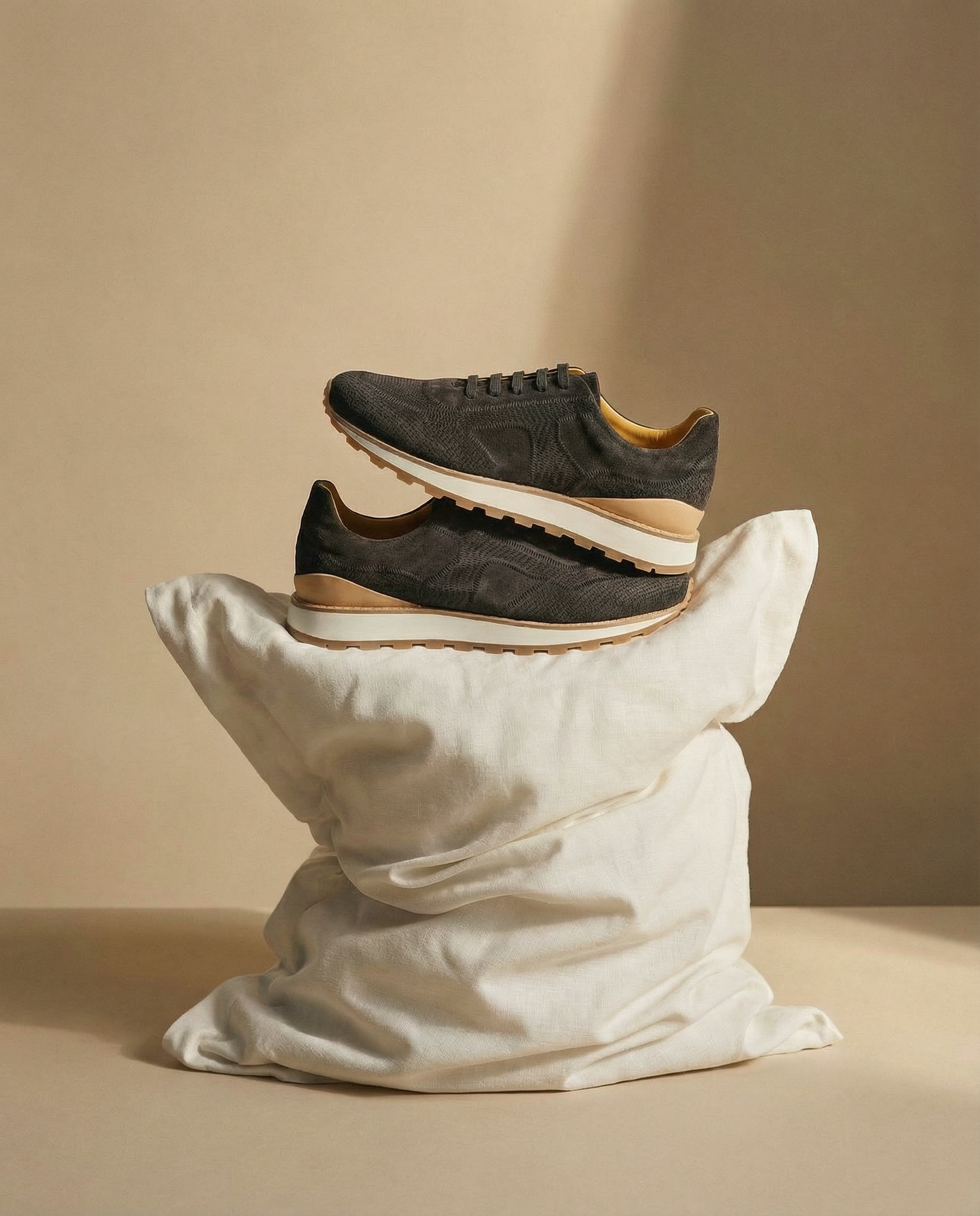 Moena 运动鞋,动感充盈,触感丰润,以匠心视角重新定义运动性能。光滑麂皮与打孔科技皮革相映,透气与柔韧兼得。沿鞋身曲线蜿蜒的精密缝线,勾勒出如律动般的节奏;柔和的色调,宛若意大利晨光的轻抚。Moena,是柔韧的运动姿态——精致,从容,生机勃发。