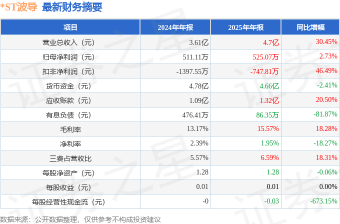 据证券之星公开数据整理,近期*ST波导(600130)发布2025年年报。截至本报告期末,公司营业总收入4.7亿元,同比上升30.45%,归母净利润525.07万元,同比上升2.73%。按单季度数据看,第四季度营业总收入1.42亿元,同比下降5.38%,第四季度归母净利润173.59万元,同比上升73.24%。本报告期*ST波导公司应收账款体量较大,当期应收账款占最新年报归母净利润比达2509.75%。